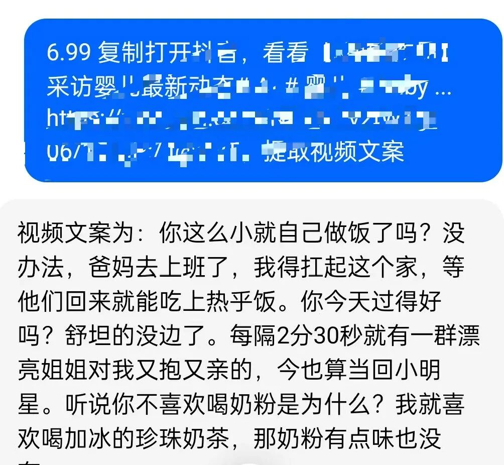 首先,写好给AI的“提示词”非常关键。你可以先去抖音找一些播放量高的“AI婴儿采访”视频,把链接复制下来,然后交给智能工具(比如豆包)帮你提取里面的文案。