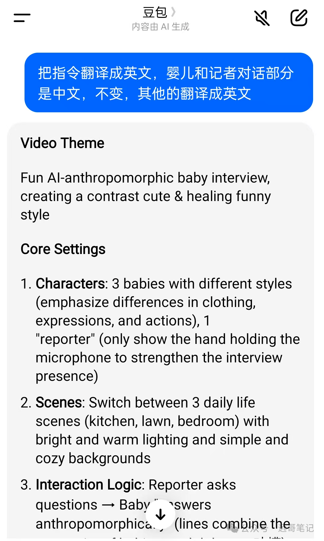 提取出来之后,先别急着用,可以再请它帮忙把这个文案扩展成一个更详细的视频脚本。脚本越细致越好,比如宝宝穿什么衣服、做什么表情、带什么动作,每一句台词怎么讲……细节越多,AI生成的效果就越符合你的期待。