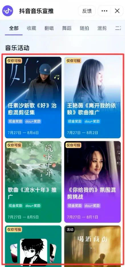 点进去之后,会看到很多不同的音乐推广任务,选一个你喜欢的音乐就可以开始制作视频了。奖励主要是看点赞数量来计算的,每1000个点赞差不多能拿到150元,一万点赞以上还会有额外鼓励,最多的时候一条视频能拿到8000以上。如果你的内容做得特别好的话,还有机会得到平台的流量支持,最高能达到2000 DOU+哦。