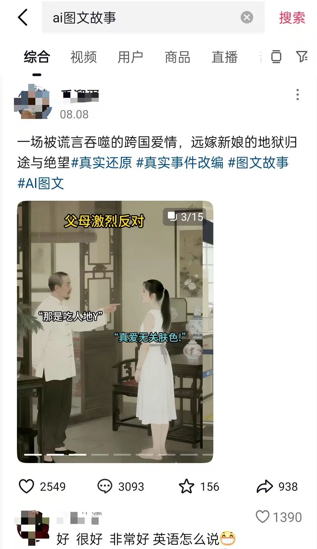 首先,素材方面可以直接参考抖音上现成的热门内容。现在有很多做 AI 图文故事的博主,发布过不少受欢迎的作品。我们可以借鉴这些内容,进行二次创作,再发布到公众号上——热门的内容往往有再次传播的潜力。只需要在抖音搜索“AI 图文故事”,就能找到很多可参考的案例。尽量挑选那些点赞、评论多一些的,比如超过两百赞的,通常话题性更强。