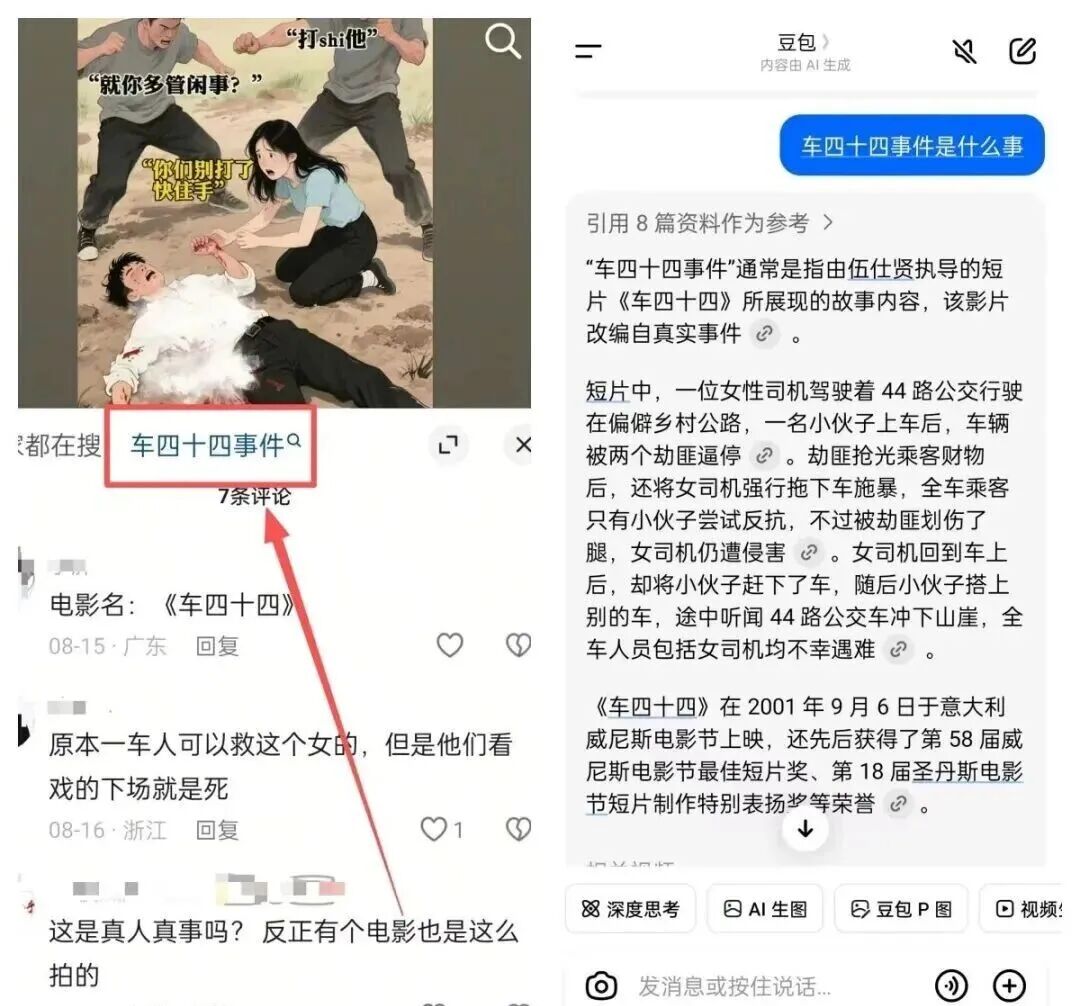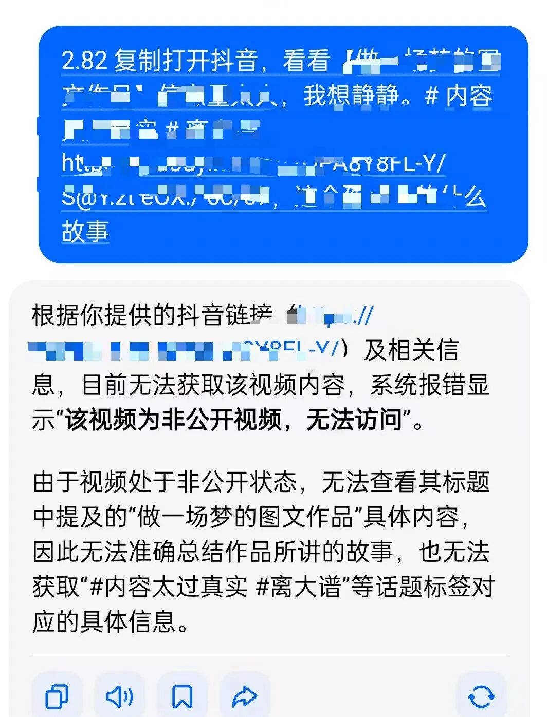 之前我试过直接把抖音链接丢给 AI,希望它帮我提取文字,但其实很多工具识别不了图片里的内容。后来我发现一个小窍门:点开抖音作品后,下方常会出现一些蓝色关键词链接,那是其他用户搜过的相关话题。把这些关键词交给 AI,比如问它“这是一个什么故事?”,它就能生成比较完整的叙述。