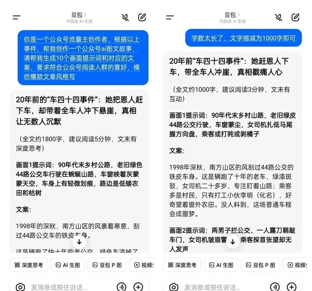 接下来是文案部分。借助 AI 写作并不难,关键是清楚地表达你的需求。比如我会设定自己的身份是“公众号故事写作者”,向 AI 详细说明想要的内容方向。一开始 AI 给出的内容可能偏长,不太适合手机阅读,我就请它调整到干练一些,比如一千字左右,结果往往更合适也更自然。