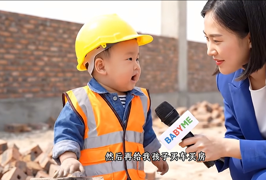 其实经常看短视频的朋友,可能早就刷到过类似的内容了:一个记者模样的人,对着看起来才一两岁的小宝宝提问,结果宝宝的回答特别“小大人”,比如记者问“怎么这么小就来工地呀”,宝宝居然回:“赚奶粉钱呗,还得给孩子买车买房呢!”