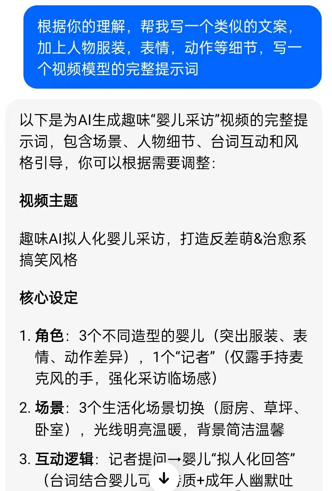 提取出来之后,先别急着用,可以再请它帮忙把这个文案扩展成一个更详细的视频脚本。脚本越细致越好,比如宝宝穿什么衣服、做什么表情、带什么动作,每一句台词怎么讲……细节越多,AI生成的效果就越符合你的期待。