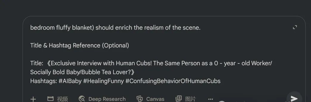 提示词准备好之后,就可以进入生成阶段了。这里推荐用谷歌的veo3这个工具,把刚才整理好的英文指令粘贴到对话框,点击生成,一段AI婴儿视频就开始制作了。