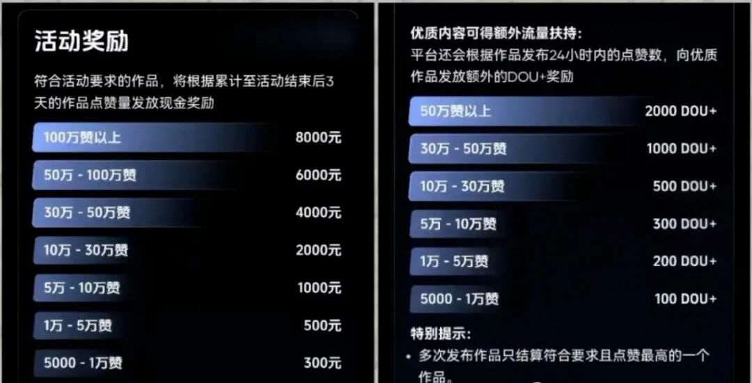 点进去之后,会看到很多不同的音乐推广任务,选一个你喜欢的音乐就可以开始制作视频了。奖励主要是看点赞数量来计算的,每1000个点赞差不多能拿到150元,一万点赞以上还会有额外鼓励,最多的时候一条视频能拿到8000以上。如果你的内容做得特别好的话,还有机会得到平台的流量支持,最高能达到2000 DOU+哦。