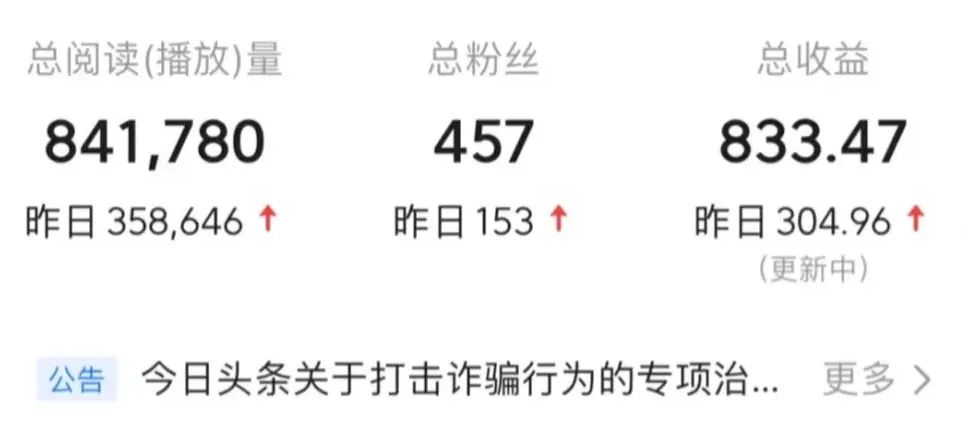 他的账号总阅读量已经超过84万,算下来已经有八百多块了,而且光是昨天一天,就有三百多。