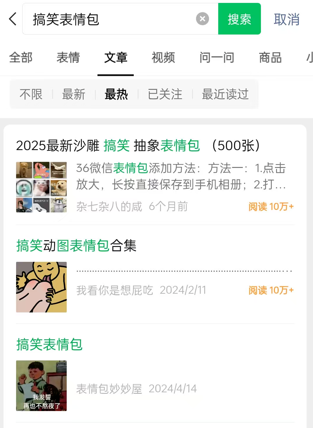 微信“搜一搜”里输入“搞笑表情包”,选“最热”,就能看到一大堆,里面还有很多博主持续更新,你可以参考一下他们的风格;今日头条里面直接搜同样的词,也能找到不少;甚至知乎上也有不少人分享这类素材。
