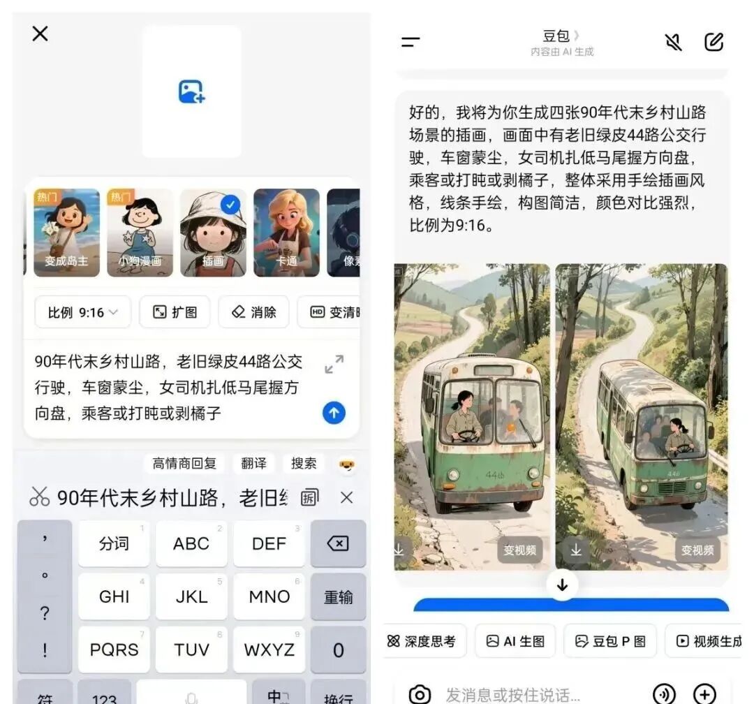 然后就是配图了。现在很多 AI 工具都自带生图功能,比如豆包里就有。把刚才整理好的提示词复制进去,选择“插画”风格,点击生成就可以了。一般根据提示词做个十张左右,整体风格统一,页面看起来就会很舒服。